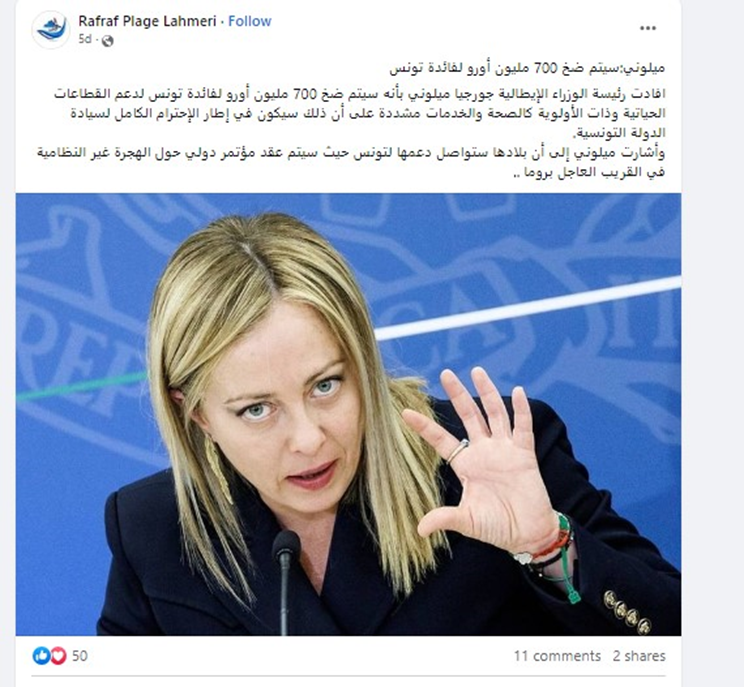 للتحقق من صحة الخبر، قام فريق منصة “موند تشاك” بالبحث عن التصريح الرسمي المنشور على الصفحة الرسمية للجمهورية الإيطالية و بالإعتماد على مواقع الترجمة تبين أن ميلوني تحدثت عن مشاريع التعاون الإيطالية التونسية والتي تبلغ قيمتها حوالي 700 مليون يورو سيقع ضخها على مراحل . ولم تذكر بوضوح أن هذا المبلغ سيتم ضخه لصالح تونس دفعة واحدة